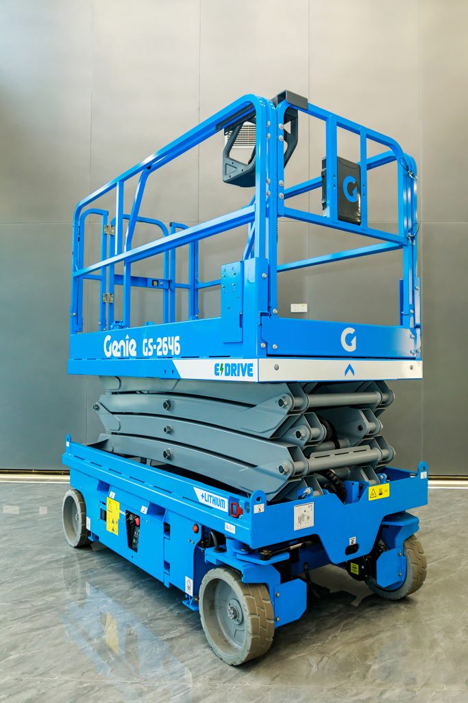 The Genie GS-2646 E-Drive is a medium-height, wide-chassis electric Slab Scissor Lift designed for indoor and flat-surface applications that prioritize stability and platform capacity. The “2646” designation indicates a platform height of approximately 26 feet and a standard chassis width of 46 inches. Featuring the modern “E-Drive” AC electric drive system, this lift delivers superior energy efficiency, smoother operation, and requires less maintenance compared to traditional hydraulic drive systems.1 The wider chassis and robust platform capacity make this lift an ideal solution for tasks requiring multiple workers, tools, and materials at height in large commercial, industrial, and institutional buildings.