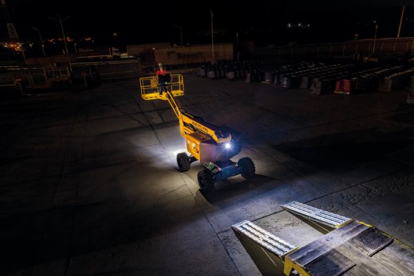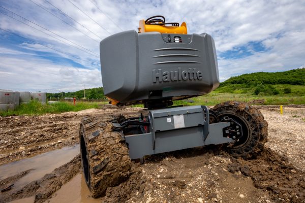 The Haulotte HA46 RTJ PRO is the high-specification, top-of-the-line Diesel-powered Rough Terrain Articulating Boom Lift, incorporating Haulotte’s latest innovations for safety and productivity. It provides a robust working height of 51 ft 11 in and an industry-leading horizontal outreach of 27 ft 3 in. The PRO model is distinguished by its 4-wheel steering (4WS), 360° continuous turret rotation, and superior ground-contact features, making it highly productive and versatile on the most demanding and restricted outdoor jobsites.