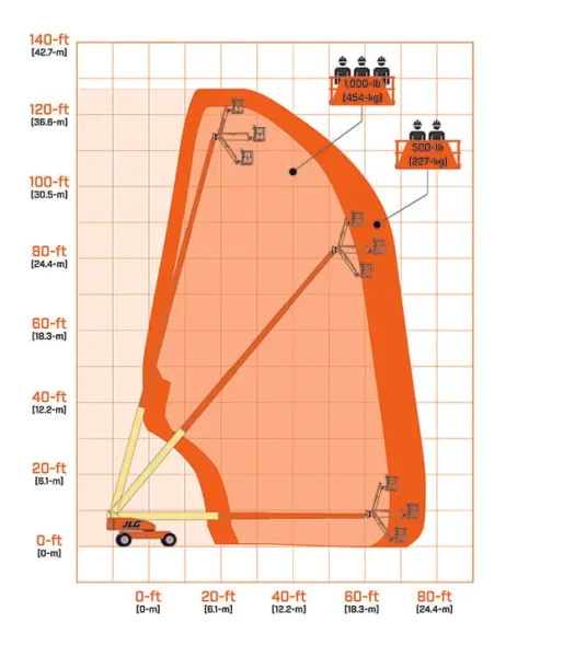 ✅ Extreme Working Envelope: Provides a commanding 126 ft working height and a massive 80 ft (24.38 m) of horizontal outreach, maximizing the working envelope for high-rise and large-scale projects.